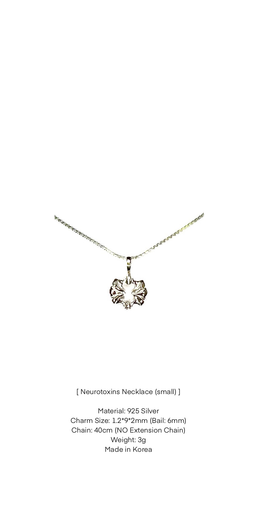 A necklace with a small pendant of Neurotoxins line signature shape. Handcrafted in 925 sterling silver. Produced in local factory located in Seoul, Republic of Korea.