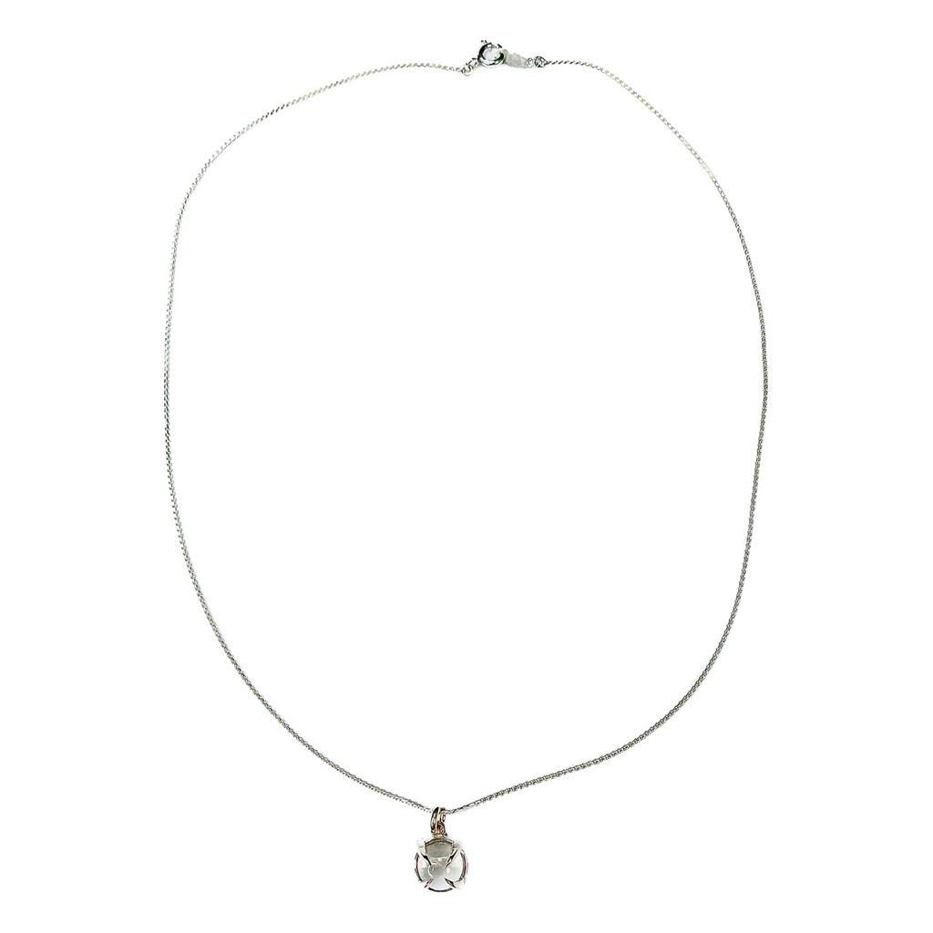 A necklace with a pendant that symbolizes a snake's jaw biting a gemstone. Handcrafted in 925 sterling silver and crystal. Produced in local factory located in Seoul, Republic of Korea.