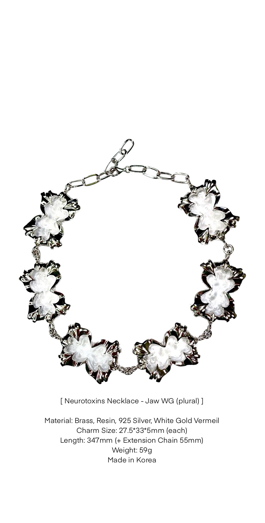 One of the OIC's signature piece from VENOM collection. The pendant symbolizes a snake's jaw that is wide opened right before spitting/biting object. Handcrafted in crystal resin, brass and 18k white gold plated. Produced in local factory located in Seoul, Republic of Korea.