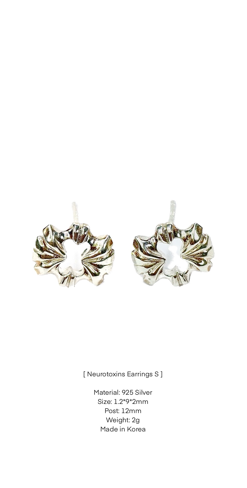 A set of earrings with small pendants of Neurotoxins line signature shape. Handcrafted in 925 sterling silver. Produced in local factory located in Seoul, Republic of Korea.