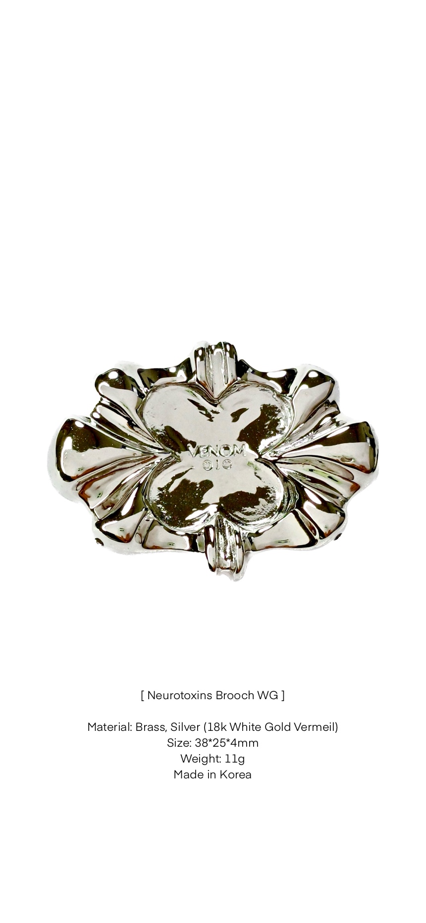 A classic brooch with engravings of brand's name and the collection's title "VENOM." Handcrafted in brass and 18k white gold plated. Produced in local factory located in Seoul, Republic of Korea.